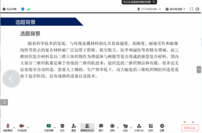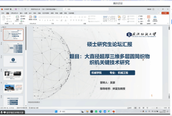 鄢梦麟同学分享了他的研究课题“大幅宽三维平板织物织机的关键技术研究”。鄢梦麟同学的研究聚焦于三维平板织物织机的关键技术,是纺织机械领域的创新研究。宋教授鼓励鄢同学深入研究关键技术的原理和应用,考虑将其应用于实际工业生产中,关注技术的实用性和经济效益。