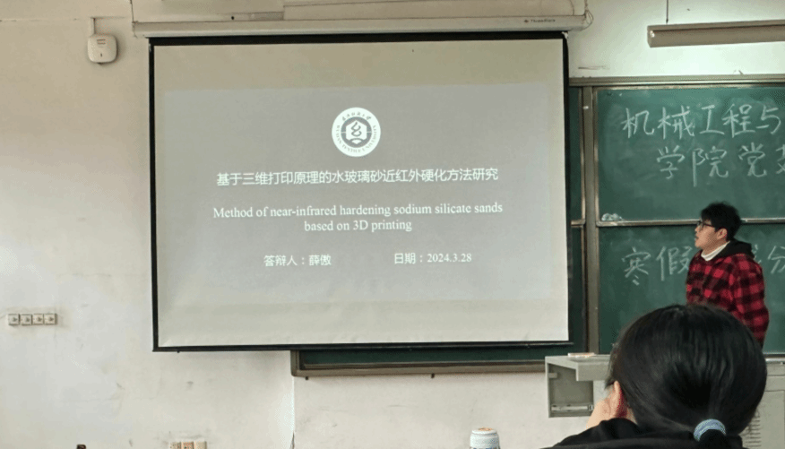 第五位是薛傲同学汇报了他的课题“基于三维打印原理的水玻璃砂近红外硬化方法研究”,将机械领域的三维打印技术同水玻璃砂材料硬化领域相结合,实现多领域方向的交叉融合。孙教授肯定了多专业结合的思路,也希望其在开展课题的过程中,可以对设备进行结构上的优化,拓宽课题未来方向。