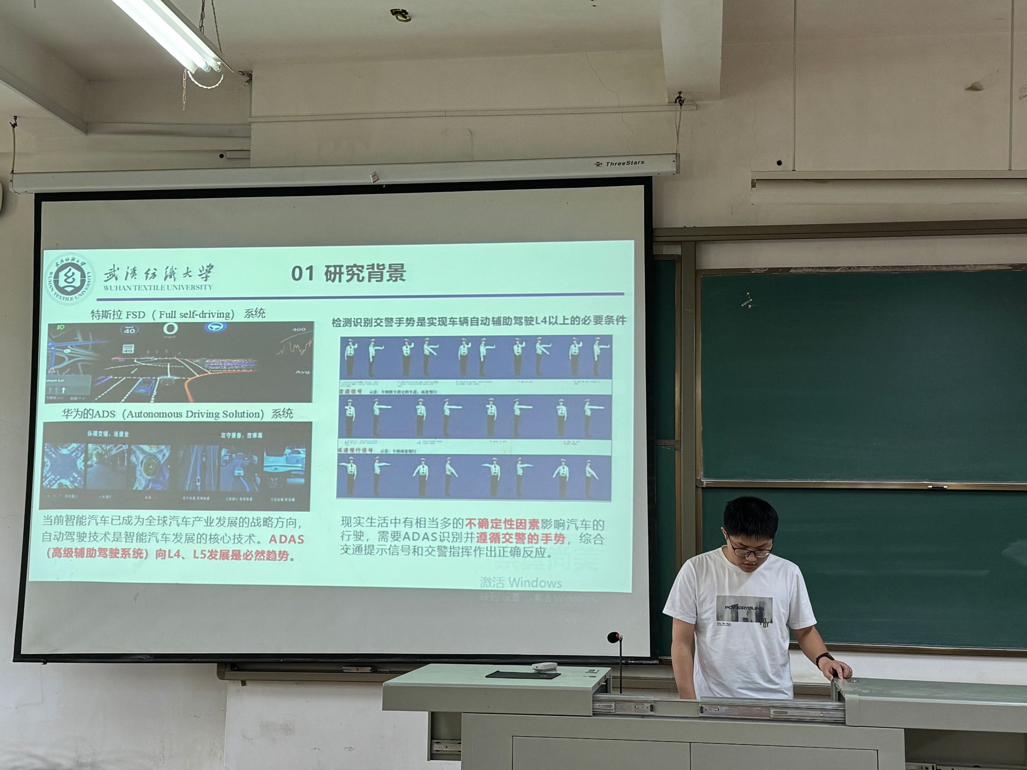 汤锦鸿同学分享了他的研究课题“基于深度学习的交警指挥手势检测识别研究”。其研究背景是当前智能汽车已经成为全球汽车产业发展的战略方向,自动驾驶技术实智能汽车发展到的核心,现实生活中有相当多的不稳定因素影响汽车的行驶,需要ADAS识别并遵循交警的手势,综合交通提示信号和交警指挥做出正确的反应。