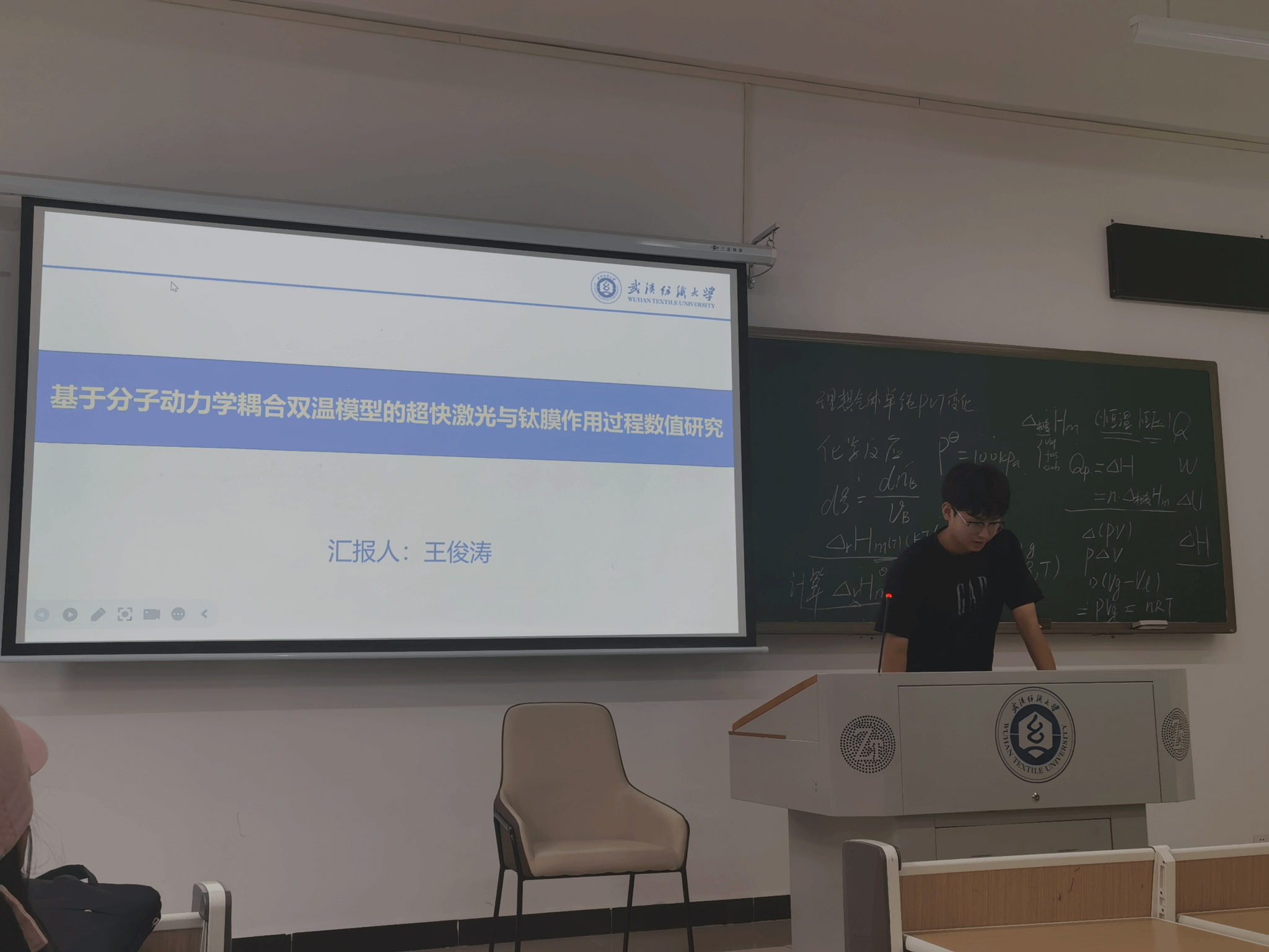 王俊涛同学分享了他的课题“基于分子动力学耦合双温模型的超快激光与钛膜作用过程数值研究”,其研究的课题目标是通过分子动力耦合双温模型的方法研究超快激光与钛膜作用过程,探究单脉冲情况下激光波长、能量密度、脉冲密度等参数对超快激光加工钛膜的影响,进行应力分析,并对模型进行验证,通过仿真达到指导实验的目的。