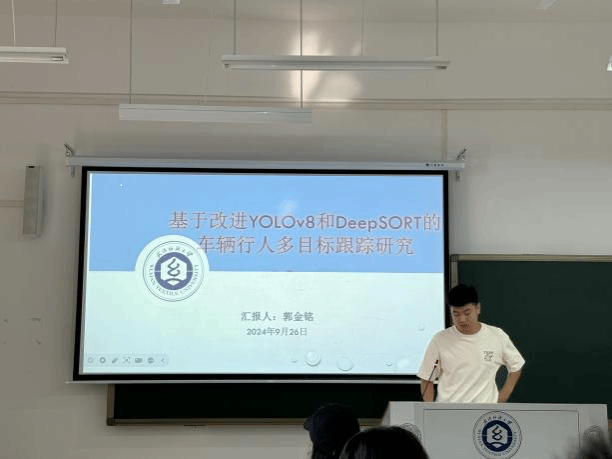 郭金铭同学分享了他的课题“基于改进YOLOv8和DeepSORT的车辆行人多目标跟踪研究”,其研究的目标是采用轻量级网络结构,双路径预测,通过独特的双路径预测和紧密连接的卷积网络进行目标检测,提高检测精度,将目标检测任务分解为分类和定位两个独立的子任务,每个子任务都有自己的网络路径。