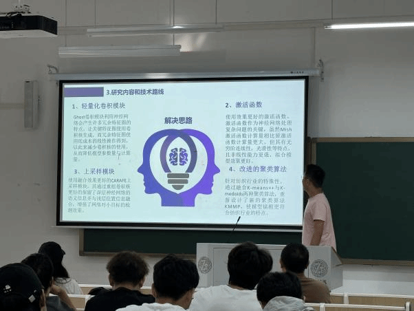 唐力同学分享了他的研究课题“基于神经网络的改进YOLOv7-tiny的织物疵点检测算法研究”。其研究的内容分为轻量化卷积模块、上采样模块、卷积函数、改进的聚类算法,在轻量化卷积模块上的Ghost卷积模块利用神经网络会产生许多冗杂特征图的特点,让关键特征图使用卷积核生成,而冗余特征图使用低成本的线性操作得到,从此来减少卷积核的使用,从而降低模型参数量和计算量。