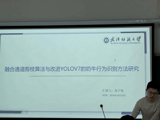 袁宇翔同学分享了他的课题“融合通道剪枝算法与改进YOLOv7的奶牛行为识别方法研究”,研究的内容分别为数据集的构造、模型的训练以及模型的改进优化。