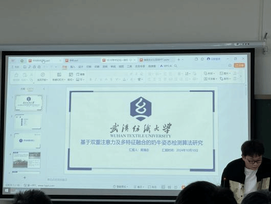 吴瑞志同学分享了他的课题“基于双重注意力及多特征融合的奶牛姿态检测算法研究”,研究的内容是对数据的采集,对数据进行预处理,制作相应的数据集,模型的搭建以及模型的训练,对训练出的模型进行改进优化,最后进行实验验证。