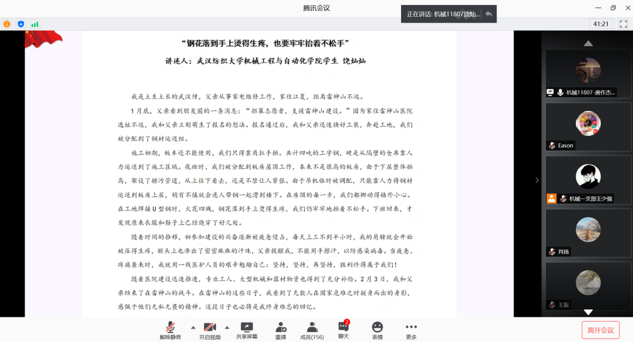 本次党课的主题是“疫情时中国企业的反应速度与贡献”,机械员工第一党支部预备党员唐作杰同志通过详细的数据对比,具体的事例分析,为我们展示了中国企业在疫情防控中做出的卓越贡献,也让我们对“中国速度”有了进一步的了解。党课中,18级饶灿灿同学做了典型发言,他讲述了他在雷神山医院建设初期做志愿者的所见所闻。为大家描述企业加班加点赶进度,被送上救护车的工人,血和泪堆积起来的雷神山完美诠释了什么是中国精神。