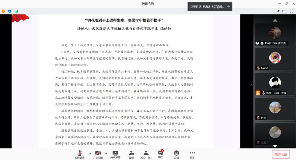 16级党员毕业生代表向鑫波在发言中表达了自己对公司和公司的感恩之情,分享了自己在校期间的收获与成长,号召毕业生党员同学们勇于要有投身“国之重器”重点领域建设的爱国情怀,怀有“把小我融入大我,把青春献给祖国”的信念,在“与祖国同行”中奉献无悔青春。抗疫员工典型饶灿灿发言分享自己在雷神山医院建设的事迹,鼓励毕业生党员勇于担当责任,将强兴国之任务扛起来,相信不久的将来,中华民族伟大复兴之路一定坚实又璀璨。