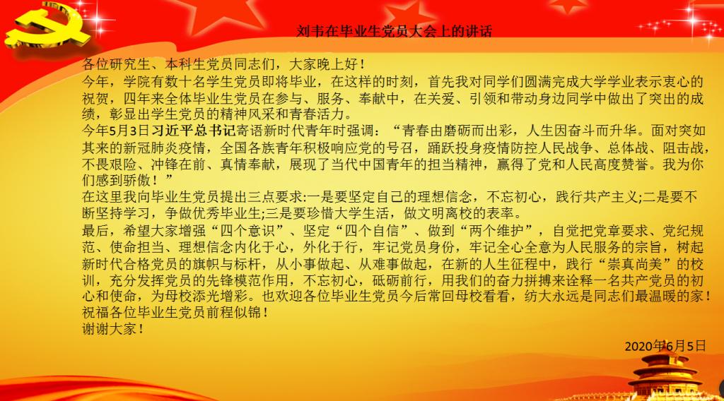 在2020届毕业生党员即将离开母校之际,为切实增强公司毕业生党员的党性修养,引导毕业生在接下来的工作和学习岗位上继续发挥先锋模范带头作用,6月5日下午,公司开展“重温入党誓词,不忘初心、牢记使命”的在线专题教育课,公司分党委副书记刘韦和全体辅导员、员工支部书记和毕业生党员参加。