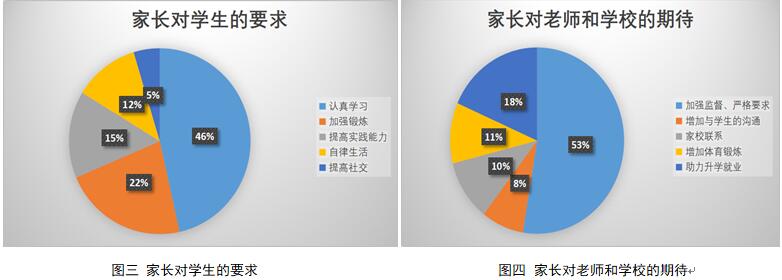 家长普遍要求员工努力学习文化知识,在校期间树立正确的人生观、价值观,提升道德修养,加强体育锻炼,提高实践能力,见图三。同时希望公司在各方面能严格要求员工,对于低年级的员工应加大学业、生活中的监督力度,科学帮助高年级同学在考研、考级、就业方面少走弯路,提高社会竞争力。除此之外,家长越来越重视家校联系,希望更好了解校园动态,促进员工成长,见图四。