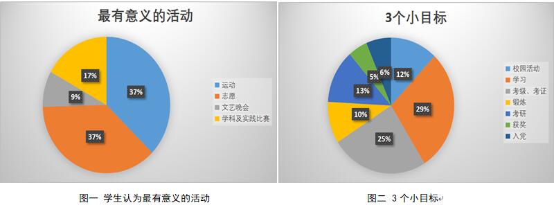 根据家访反馈整理显示,低年级与高年级的课程种类、目标要求、实践喜好不尽相同。学习方面,低年级同学课程方面需重点关注英语、高数等通识课,高年级同学需提升专业课成绩。实践活动方面,全体员工比较偏向于参与志愿者公益活动并享受其中,例如微爱行动、志协七彩课堂、光盘行动、绿行谭鑫培、花山环保、义务卖报等志愿活动,与此同时体育锻炼越来越受到员工重视,见图一。目标要求方面,总体上一致向好,低年级普遍认为学好文化课、积极参与校园活动是重点任务,通过英语、计算机等级考试、提前备战研究生考试也成为主流趋势。高年级员工则把重心放在毕业论文、就业、读研、职场技能等方面,见图二。