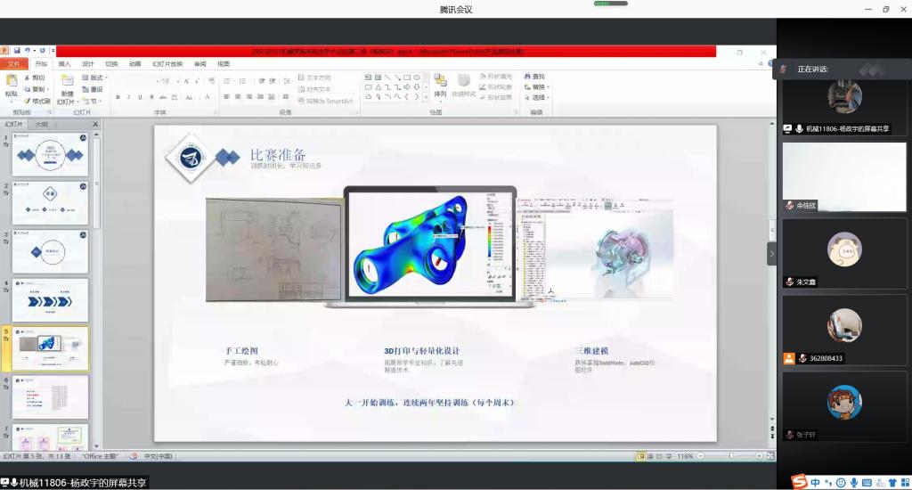最后,刘韦老师对杨政宇同学及其团队获得的成绩给予充分的肯定,他表示自己所接触到的制造型企业的HR都非常看中同学们的画图能力,因此掌握好了本领会为今后找到一份满意的工作打下坚实基础。并呼吁同学们都积极加入学科竞赛协会组织,打破专业界限,全方面发展自己。