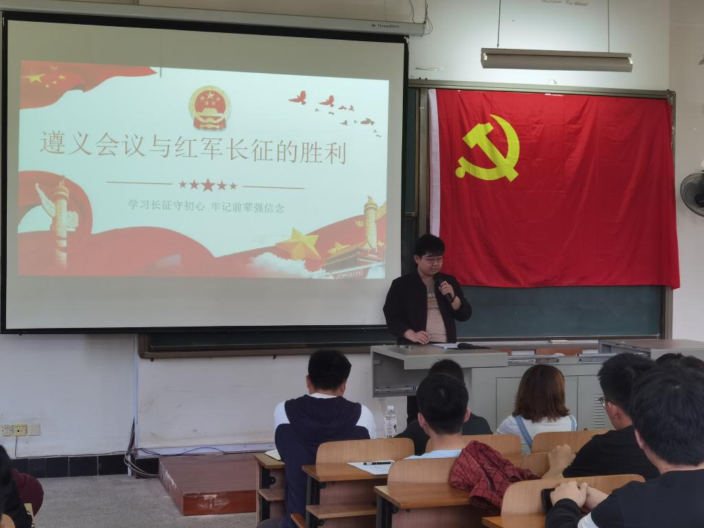 然后,机械员工第一党支部预备党员卢国盛同志给大家讲解了关于“遵义会议与红军长征的胜利”党史故事。他声情并茂地为大家讲解了长征的历史背景和战略意义,展示了长征的行军路线和艰苦场面。在他的介绍下,同学们对红军长征这段可歌可泣的历史有了更加深入全面的认识,领悟了要坚定信念、严守纪律、艰苦奋斗的长征精神和以爱国主义为核心的民族精神。
