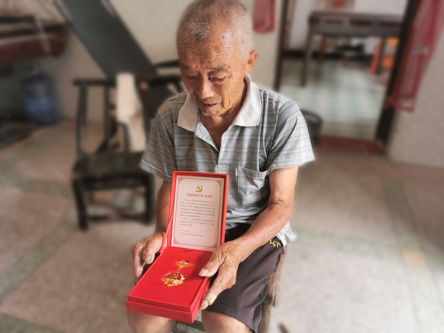实践队员在岩泉村村支书陈世海的引导下,先后拜访了三位老党员,并将米、油等生活物资送到了老党员们的手中。队员们前往拜访的第一站是陈绪勋老人的家。据陈世海村支书介绍:陈绪勋老人是一位有着五十年党龄的老党员,曾担任三十年的村支书,现今已是九十岁高龄。在交流中,队员们发现陈老先生已经记不起年轻时的事迹,但当采访小组问到他当年为什么选择加入共产党时,他抚摸着怀里的那块“光荣在党50年”奖章,眼神突然坚定起来,说道:“孩子们,我已经老了,很多事情都记不清楚了,但这件事我却是记得清清楚楚,村子里有很多人为了我们的幸福生活去抗击敌人,牺牲了,当时的我没有别的想法,只是想着一定要努力做点什么、一定要贡献得比其他人更多,党员的身份使我时刻牢记自己的这份理想,使我能够更加坚定地去追随烈士们的脚步、追逐心中的信仰......”