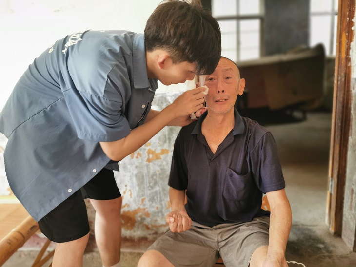 最后,实践团队在陈支书的引导下,来到了陈绪柏老人的家里。陈绪柏老人因身体原因已不能自如地与大家交流,但他布满皱纹的皮肤和黝黑的肤色仿佛在向大家讲述着老先生的光辉事迹。当得知是老员工专程前来看望他时,陈绪柏老先生的眼中顿时盈满了泪水,他的女儿向大家解释道:老人对中国共产党的感情已深入心底,当看到一个个年轻的党员和入党积极分子朝气蓬勃走来时,他的心里倍感欣慰,激动的心情不能通过言语来表达,只能用动作和泪水来传达自己的心意。队员们纷纷掏出纸巾为老人擦拭眼泪,表示能读懂他的意思、明白他的心底话,自己作为青年党员一定不会辜负他的期望,承上启下,将老人爱党爱国、坚守初心的红色基因继续传承下去。