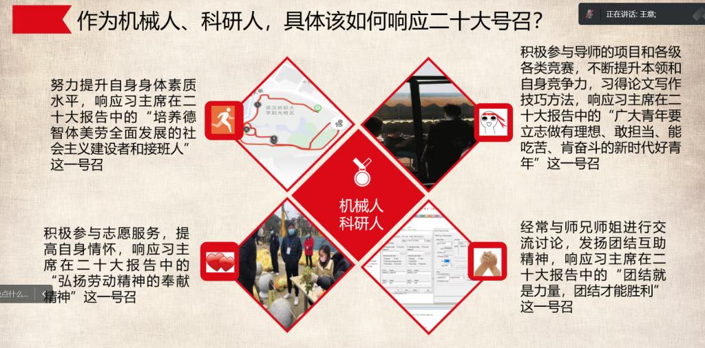 新征程是充满光荣和梦想的远征,研究生支部要围绕研究生的发展方向做好“党建+”,推进党建与中心工作深度融合,要充分处理好理想与现实之间的关系、个人与集体之间的关系,切实发挥党员作用,聚焦研究生政治品德、学习思维、团队协作、创新实践等素质和能力的培养,引导大家立鸿鹄志,做奋斗者,增强责任感和使命感,汲取不忘初心、牢记使命的前进力量和智慧。