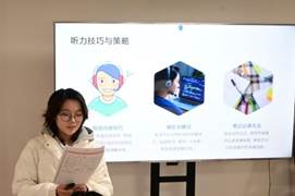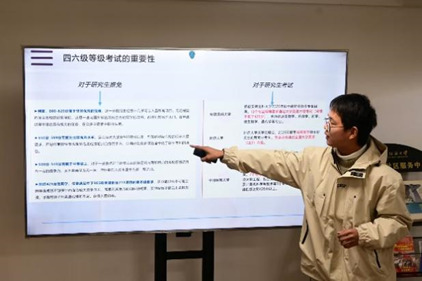 活动开始,白老师首先祝贺创新班同学上学期顺利通过英语四级考试,介绍了两位优秀学长学姐的英语成绩。随后,司徒少华从英语四六级备考的时间规划、模块分析、实战模拟等方面逐一分享经验,重点讲解了复习备考的重难点及解决方案,分享了有效的学习方法。张庆乐首先介绍了英语四六级的重要性,紧接着从英语六级听力、阅读、写作等模块开展备考技巧分享,希望大家保持良好的备考心态、积极进取。